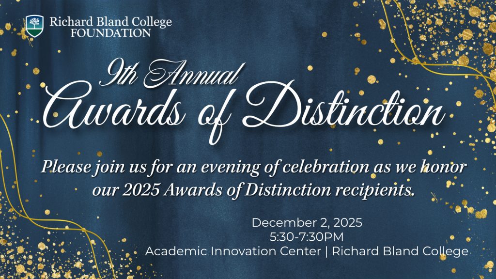 You are cordially invited to Richard Bland College’s 9th Annual Awards of Distinction, an elegant evening dedicated to celebrating excellence and honoring our outstanding 2025 Awards of Distinction recipients. Join us on December 2, 2025, from 5:30–7:30 PM at the Academic Innovation Center for a night of recognition, inspiration, and community. We look forward to sharing this special occasion with you!